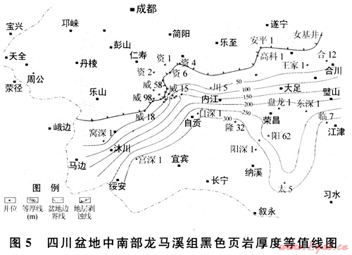 根據(jù)現(xiàn)有鉆井資料,筆者繪制了筇竹寺組和龍馬溪組黑色頁(yè)巖在四川盆地中南部的厚度分布圖。從圖4、5可以看出,除龍馬溪組黑色頁(yè)巖在古隆起頂部被剝蝕殆盡外,這兩套黑色頁(yè)巖在大部分區(qū)域內(nèi)均穩(wěn)定分布,厚度一般都在200m以上,而且均有向南或東南方向逐漸增厚的趨勢(shì)。