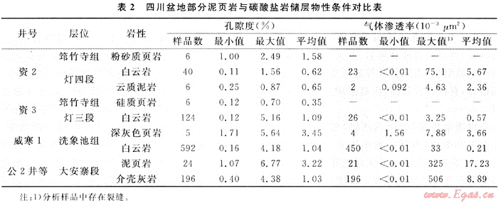 眾所周知,泥頁(yè)巖本身的孔滲性超低而致密,故一般在油氣藏的形成中起封蓋作用。但是,在四川盆地多套含油氣層系中,泥頁(yè)巖與同層的碳酸鹽巖儲(chǔ)層相比,其物性條件相差無幾(表2)。特別是在有裂縫存在的條件下,泥頁(yè)巖往往也具有較高的滲透能力,可形成·種非常規(guī)油氣層——泥頁(yè)巖裂縫性油氣層(例如侏羅系大安寨和涼高山油氣層)。在四川盆地今后的非常規(guī)油氣勘探中,理應(yīng)重視這種特殊類型的泥頁(yè)巖儲(chǔ)集層。