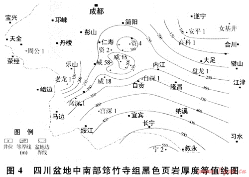 下古生界黑色頁(yè)巖集中分布在下寒武統(tǒng)筇竹寺組、下奧陶統(tǒng)大灣組和五峰組及下志留統(tǒng)龍馬溪組等4個(gè)層段中。大灣組(或大乘寺組)黑色頁(yè)巖在盆地西南部較發(fā)育,其厚度一般在45~140m,特別是在威遠(yuǎn)地區(qū)分布穩(wěn)定,也是未來下古生界頁(yè)巖氣勘探值得重視的一套目的層。五峰組黑色頁(yè)巖雖分布穩(wěn)定,但厚度較薄,一般只有幾米,且與龍馬溪組整合接觸,特征類似。限于資料,筆者僅針對(duì)筇竹寺組和龍馬溪組兩套黑色頁(yè)巖開展分析與討論。