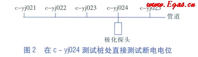為了得到管道任意位置的陰極保護(hù)數(shù)據(jù),包括定向鉆穿越段中間部位、丟失的測(cè)試樁、占?jí)簾o(wú)法打開(kāi)的測(cè)試井等處的陰極保護(hù)數(shù)據(jù),擬采用拉銅線和極化探頭相結(jié)合的方法進(jìn)行測(cè)試。為了驗(yàn)證該方法的可靠性及準(zhǔn)確性,選取c-yj024測(cè)試樁作為管道上任意測(cè)試點(diǎn)。步驟為: