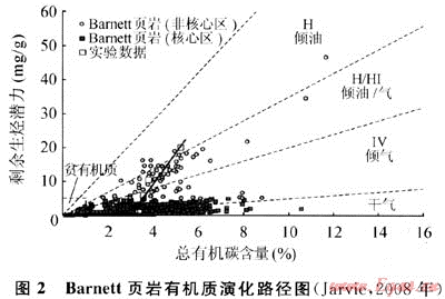 需要注意:初始有機(jī)質(zhì)豐度較高的烴源巖,隨著熱演化程度加深,生烴量增加,殘余有機(jī)碳豐度、氫指數(shù)、有機(jī)質(zhì)類型呈現(xiàn)降低、變差趨勢(shì),如Tmax(最大熱解溫度)432℃、等效成熟度0.62%,Barnett頁(yè)巖演化至Tmax為470℃,等效成熟度為1.3%時(shí),TOC數(shù)值可降低36%(圖2),對(duì)于高成熟和/或過(guò)成熟烴源巖,負(fù)面影響則更大,所以簡(jiǎn)單套用殘余有機(jī)碳豐度、氫指數(shù)或于酪根類型判斷頁(yè)巖生氣能力的高低可能有失偏頗。但儲(chǔ)集能力而言,殘余有機(jī)質(zhì)豐度??杀碚骱瑲饬看笮?,特別是當(dāng)兩者呈現(xiàn)正相關(guān)情況下。北美頁(yè)巖氣勘探目標(biāo)絕大多數(shù)選擇TOC含量大于2%,甚至4%以上,與此有關(guān)聯(lián)。因此資源潛力評(píng)價(jià)過(guò)程中應(yīng)綜合考量有機(jī)質(zhì)豐度指標(biāo),既要重視源巖原始有機(jī)質(zhì)豐度與生烴潛力,又要關(guān)注頁(yè)巖儲(chǔ)層殘余總有機(jī)碳含量的作用。