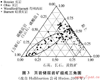裂縫發(fā)育受內(nèi)、外因控制。外因主要與生烴過(guò)程、地層孔隙壓力、各向異性的水平壓力、斷層與褶皺等構(gòu)造作用相關(guān),內(nèi)因主要取決于頁(yè)巖礦物學(xué)特征。圖3展示了已開(kāi)發(fā)頁(yè)巖的兩個(gè)分布區(qū)域:Bossier頁(yè)巖大都位于石英、長(zhǎng)石和黃鐵礦含量低于40%,碳酸鹽巖含量大于25%,黏土礦物低于50%區(qū)間;Ohio、Woodford/Barnett頁(yè)巖位于碳酸鹽含量低于25%,石英、長(zhǎng)石和黃鐵礦含量20%~80%,黏土含量在20%~80%區(qū)間,其中Barnett硅質(zhì)頁(yè)巖黏土礦物通常小于50%,石英等含量超過(guò)40%,Arkoma盆地Woodford頁(yè)巖與其相近。即頁(yè)巖膨脹性黏土礦物含量較少,硅質(zhì)、碳酸鹽巖等礦物較多時(shí)(Fort Worth盆地Barnett頁(yè)巖典型值為40%~60%),巖石脆性與造縫能力強(qiáng),裂縫網(wǎng)絡(luò)容易產(chǎn)生。