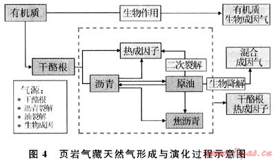 研究表明,熱成因氣的形成有干酪根成氣、原油裂解成氣和瀝青裂解成氣3種途徑:①干酪根成氣是由沉積有機質(zhì)直接熱解形成天然氣。②原油裂解成氣是有機質(zhì)在液態(tài)烴演化階段形成的、滯留在烴源巖中的液態(tài)烴,經(jīng)深埋藏后的高溫、高壓作用,進一步裂解成氣。③瀝青裂解成氣的物質(zhì)基礎(chǔ)來源于兩個方面:一是源巖中干酪根在各演化階段生烴過程中形成的,另一方面是由原油裂解成氣或遭破壞形成的。原油及瀝青二次裂解生成的天然氣量大小主要取決于烴源巖中有機質(zhì)豐度、類型以及液態(tài)烴殘留量。由烴源巖有機質(zhì)熱演化直接成氣及原油裂解成氣是頁巖氣藏中天然氣的主要來源。