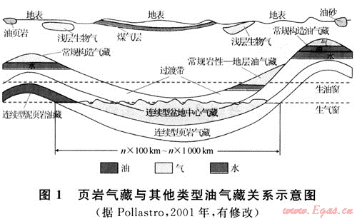 2) 無明顯圈閉:傳統(tǒng)上的常規(guī)油氣均聚集在圈閉中,圈閉是油氣藏形成的基礎(chǔ),決定著油氣藏的基本特征以及勘探方法。頁巖氣藏雖在字面上還稱之為藏,實則沒有藏的邊界,即頁巖氣不是聚集在某個圈閉中成藏的,而是包含盆地中已經(jīng)進入生氣窗范圍內(nèi)的所有烴源巖中皆可成藏(圖1)。常規(guī)油氣藏,即使是巖性油氣藏,都是在一定的構(gòu)造背景下形成的,而頁巖氣藏不受構(gòu)造因素的控制。
