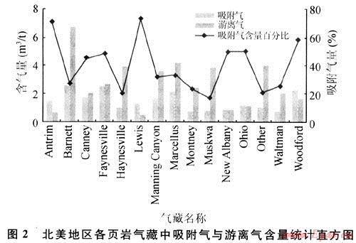 圖2為美國頁巖氣藏中的氣體組成統(tǒng)計結(jié)果,表明不同地質(zhì)條件下形成的頁巖氣藏其吸附氣與游離氣的含量存在較大差別。頁巖氣藏中吸附氣含量比例較高,變化范圍較大。頁巖含氣量最高的(如Barnett頁巖氣藏)可達10m3/t,最低(如New Albany頁巖氣藏)僅有1.1m3/t,含氣量平均為3.81m3/t。其中,吸附氣含量最低為16%,最高達80%。吸附氣含量的變化主要受巖石組成、有機質(zhì)含量、地層壓力、裂縫發(fā)育程度等因素影響,詳見后述。