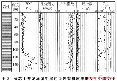 對上揚(yáng)子地區(qū)下志留統(tǒng)龍馬溪組有機(jī)碳含量統(tǒng)計,發(fā)現(xiàn)下志留統(tǒng)龍馬溪組有機(jī)碳含量變化大,分布在0.1%~8.65%之間,多數(shù)大于1%。長寧-珙縣地區(qū)鉆探的長芯1井,通過對龍馬溪組下部黑色頁巖153m連續(xù)取心的有機(jī)碳含量分析(圖3)同樣反映出這種變化特征。在110m以淺,TOC含量處在1%~3%之間,平均為2%,110~153m井段(龍馬溪組最底部)TOC均大于2%,平均值可達(dá)到6%。全井段統(tǒng)計,TOC>2.0%的累計厚度可達(dá)80m,主要分布于龍馬溪組下段(包括上奧陶統(tǒng)約10m的五峰組碳質(zhì)頁巖),這將是形成頁巖氣藏最有利層段。