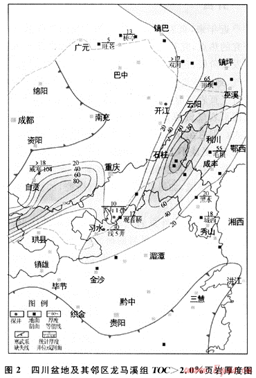 圖2是四川盆地及其鄰區(qū)下志留統(tǒng)龍馬溪組TOC>2.0%的黑色頁巖累計厚度分布圖。由圖2可見,龍馬溪組TOC>2.0%高值區(qū)分布于川東石柱-鄂西利川,黑色頁巖厚達(dá)100m,川北鎮(zhèn)巴黑色頁巖厚20m,川南瀘州一帶厚60~80m。3個高值區(qū)的分布在地質(zhì)上和川東-鄂西深水陸棚沉積相帶、川北深水陸棚沉積相帶以及川南深水陸棚沉積相帶分布相吻合。