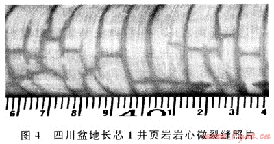 上揚(yáng)子地區(qū)除四川盆地外,其余地區(qū)勘探程度非常低,且無論是四川盆地還是四川盆地以外的探區(qū),已往的油氣勘探實(shí)踐中,都沒有把頁巖地層當(dāng)做有效目的儲層對待。因此,開展頁巖儲層的研究甚少[3~4]。四川盆地長寧構(gòu)造所鉆的長芯1井8個志留系頁巖樣品的巖礦組成分析結(jié)果見表1。長寧構(gòu)造龍馬溪組頁巖巖礦組成中,黏土最多,含量為26.5%~59.5%,平均48.25%,其次是石英,含量為20.5%~29.7%,平均25.3%,方解石含量為4.1%~26.9%,平均12.4%。與美國已知含氣頁巖相比,該井硅質(zhì)(石英)含量偏少,而黏土(伊利石為主)含量偏高,根據(jù)美國經(jīng)驗(yàn),這似乎對頁巖儲層的脆性有影響。但仔細(xì)分析發(fā)現(xiàn),該井的方解石總量較高,石英和方解石總量達(dá)37%,表明該套頁巖具有脆性巖石組分。野外剖面可見風(fēng)化破碎的龍馬溪組筆石頁巖,且在露頭和長芯1井巖心上均可發(fā)現(xiàn)頁巖高角度縫和微裂縫十分發(fā)育(圖4),揭示了該區(qū)頁巖具有良好的脆性特征。