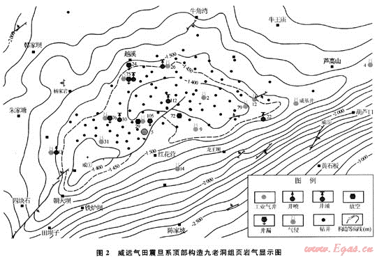 前已述及,威遠(yuǎn)氣田鉆穿下寒武統(tǒng)九老洞組的107口井中,有29口井在九老洞組頁(yè)巖中的不同井段出現(xiàn)了不同級(jí)別的天然氣顯示,筆者將這些顯示井分別標(biāo)注在威遠(yuǎn)氣田震旦系頂面構(gòu)造圖上(圖2)。由圖可見(jiàn),九老洞組頁(yè)巖氣顯示井的平面分布及顯示特點(diǎn)與下伏震旦系氣井的分布控制因素完全不同。九老洞組頁(yè)巖中的氣顯示井不僅在構(gòu)造的軸部、翼部及氣水邊界內(nèi)有分布,尤其值得注意的是在該氣田氣水邊界外的東、西、南、北各個(gè)方向均有顯示井分布。如威遠(yuǎn)構(gòu)造西南的威18井已遠(yuǎn)離威遠(yuǎn)氣田的氣水邊界達(dá)16km,但在九老洞組的中部和下部還是出現(xiàn)了3個(gè)強(qiáng)烈的氣顯示井段(兩個(gè)氣顯示段達(dá)井涌、1段為氣侵)。其中3361.5~3363.5m顯示段,在鉆井過(guò)程中放空0.3m,并發(fā)生井涌。氣測(cè)全烴由55%增至100%,泥漿噴出轉(zhuǎn)盤(pán)面0.5m,氣侵、井涌猛烈,且持續(xù)井涌時(shí)間長(zhǎng)達(dá)2a。