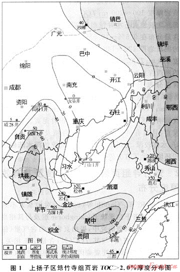 筆者在研究上揚(yáng)子區(qū)下寒武統(tǒng)筇竹寺組頁(yè)巖氣成藏條件分析時(shí),首先根據(jù)黃籍中等(2006)[4]、梁狄剛等(2008)[2]和黃先平、王世謙等(2002)對(duì)筇竹寺組頁(yè)巖有機(jī)質(zhì)豐度及其熱成熟度的研究資料,結(jié)合美國(guó)從事頁(yè)巖氣勘探開(kāi)發(fā)油公司所確定有效頁(yè)巖有機(jī)質(zhì)豐度下限值等資料,并結(jié)合中國(guó)海、陸相源巖有機(jī)質(zhì)豐度分布的實(shí)際,進(jìn)行了上揚(yáng)子區(qū)下寒武統(tǒng)筇竹寺組頁(yè)巖有效厚度分布研究。