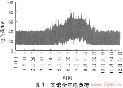 賓館的電負(fù)荷具有季節(jié)性特點(diǎn),夏季電負(fù)荷明顯高于冬季。賓館冬季典型日電負(fù)荷比較穩(wěn)定,晚間用電負(fù)荷明顯增加;由于使用空調(diào),夏季典型日電負(fù)荷比冬季增加近1倍。
