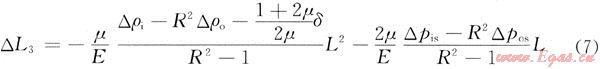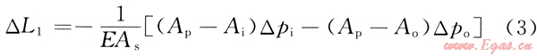 當(dāng)測(cè)試管柱內(nèi)流體流動(dòng)而環(huán)形空間的流體不流動(dòng)一時(shí),其管柱長(zhǎng)度變化△L3為: