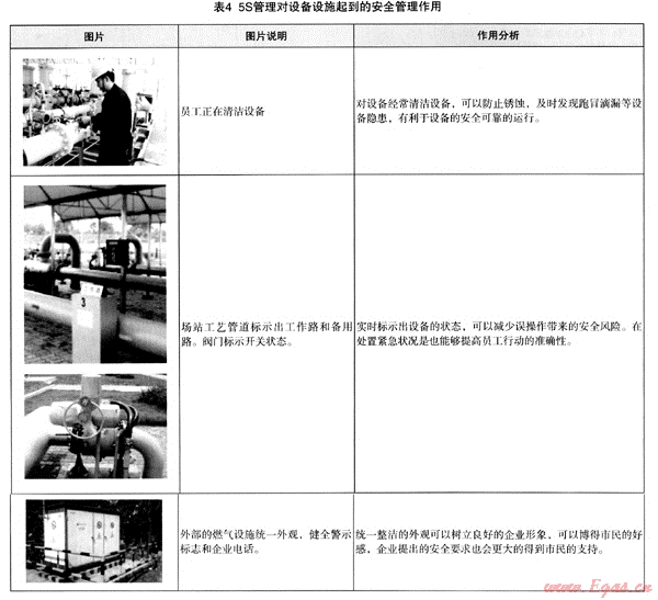 3.2.2燃?xì)庠O(shè)施遍布全市,不僅是場(chǎng)站之內(nèi)的設(shè)備設(shè)施,更多的中、低壓燃?xì)庠O(shè)施分布于全市各處公共場(chǎng)所。設(shè)備設(shè)施的安全可靠是企業(yè)安全管理的重要內(nèi)容。企業(yè)除了通過(guò)0HSAS18001制定出各種巡查、維護(hù)、保養(yǎng)工作規(guī)定和流程外,5S的目視管理,可進(jìn)一步增強(qiáng)設(shè)備的安全可靠性。見(jiàn)表4: