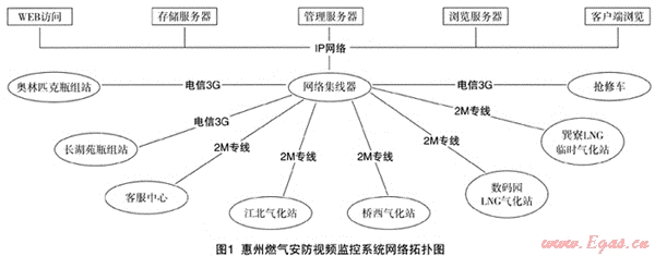 根據(jù)各場站的監(jiān)控點(diǎn)數(shù)及分布位置情況,分別采取不同的通訊線路選擇,傳輸至公司總部監(jiān)控中心。數(shù)碼同LNG氣化站、橋西氣化站江北氣化站和客戶服務(wù)中心結(jié)合辦公網(wǎng)絡(luò),租用電信2M帶寬光纖專線,進(jìn)行視頻數(shù)據(jù)的傳輸。