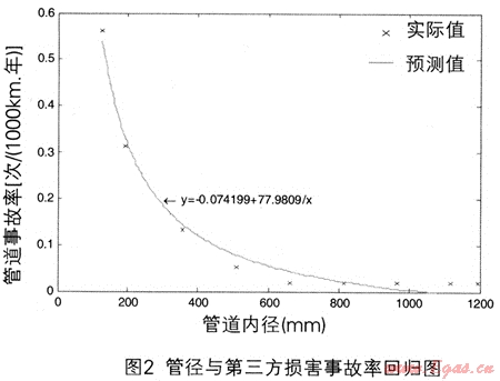 摘要:定量化和精細(xì)化管理是企業(yè)發(fā)展的必由之路,燃?xì)馄髽I(yè)老的管理模式是從事故到事故的被動搶修模式,新的管理模式是以風(fēng)險預(yù)評判為基礎(chǔ)的無事故預(yù)防型管理。風(fēng)險預(yù)評判只有建立在定量分析的水平上,才能真正具有系統(tǒng)性、精確性和預(yù)見性,所以管道事故數(shù)據(jù)的獲取和分析是定量風(fēng)險評估方法建立、改進(jìn)和完善的基礎(chǔ)?;诨貧w分析的方法預(yù)測管道事故率,事故率為因變量,自變量可以有很多種(管道內(nèi)徑、管道埋深、管壁厚度等),本文以管徑為自變量從而分析出遞變性的規(guī)律,從最具普遍性的損害原因(第三方損害)著手,借鑒國外(歐洲)燃?xì)夤艿朗鹿式y(tǒng)計資料和分析方法,得出管道事故率回歸方程,體現(xiàn)影響因素與管道事故率之間的函數(shù)關(guān)系。