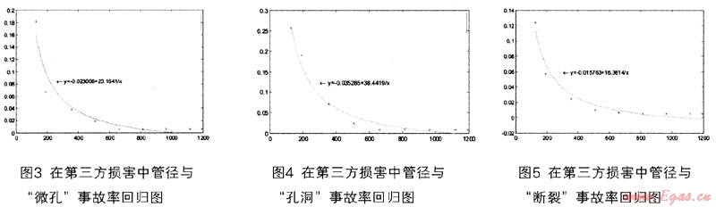 管徑與事故率的回歸方程通過了F檢驗與R檢驗,即可用來預(yù)測,所謂預(yù)測問題,就是在確定自變量的某一個X0值時求相應(yīng)的變勤的估計值。第三方損害的計算結(jié)果列于表6中,回歸圖如圖3~5所示。
