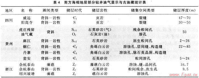 5) 鉆井天然氣顯示:不完全統(tǒng)計,早期在常規(guī)油氣勘探過程中,在100口余鉆井中見到天然氣顯示或露頭發(fā)現(xiàn)古油藏及頁巖氣顯示(表4)。據(jù)四川盆地威遠(yuǎn)地區(qū)36口鉆井統(tǒng)計,筇竹寺組頁巖有30口井發(fā)現(xiàn)氣顯示,志留系龍馬溪組13口井中有10口見氣顯示。威遠(yuǎn)地區(qū)的威5、威9、威18、威22和威28等井下寒武統(tǒng)泥頁巖均見氣侵井涌和井噴,其中威5井下寒武統(tǒng)筇竹寺組2795~2798m頁巖井段發(fā)現(xiàn)氣侵與井噴,中途測試日產(chǎn)氣2.46×104m3,酸化后日產(chǎn)氣1.35×104m3。川東南地區(qū)陽高寺構(gòu)造帶的陽深2、宮深1、付深1、陽63、陽9、太15和隆32等井在下志留統(tǒng)龍馬溪組多處發(fā)現(xiàn)氣顯示,其中陽63井下志留統(tǒng)龍馬溪組3505~3518.5m黑色頁巖段,酸化后獲日產(chǎn)氣3500m3,隆32井下志留統(tǒng)龍馬溪組3164.2~3 175.2m黑色碳質(zhì)頁巖段獲日產(chǎn)氣1948m3。另外,20世紀(jì)70年代中期在貴州大方地區(qū)鉆探的方深1井,在下寒武統(tǒng)牛蹄塘組也發(fā)現(xiàn)良好氣顯示。該井下寒武統(tǒng)牛蹄塘組鉆遇井深1686~1785m,厚99m,巖性上部為一套深灰色含碳質(zhì)粉、細(xì)砂巖與碳質(zhì)頁巖互層,中-下部為黑色碳質(zhì)頁巖。有機(jī)碳含量2.97%~8.02%;氯仿瀝青“A”含量0.087%~0.11%,成熟度為高-過成熟。鉆井中,在1723.4~1726.7m井段見氣測異常,泥漿見雨狀氣泡,含氣38%,點(diǎn)燃呈藍(lán)色火焰,下伏震旦系全井段氣測異常,電測解釋6個含氣層、3個可能含氣層。