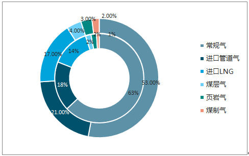2015-2017 年國(guó)內(nèi)天然氣供給結(jié)構(gòu)變化(外環(huán)為 2017 年,內(nèi)環(huán)為 2015 年)
