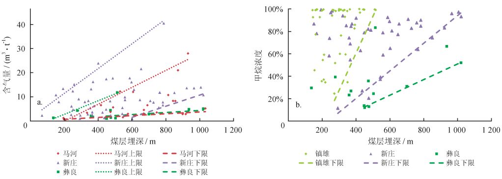 含氣量上限與煤層埋深關(guān)系呈正相關(guān)關(guān)系,含氣量下限則受煤層埋深影響較小,如馬河礦區(qū)和新莊礦區(qū)等(圖7-a),各礦區(qū)最大含氣量對應(yīng)的埋藏深度自西向東增加,可能由于西部較高的地?zé)崽荻仁古R界深度變淺[16]。甲烷濃度下限與煤層埋深呈正相關(guān)關(guān)系,甲烷濃度下限受埋深影響的顯著程度可能受到煤層厚度、煤變質(zhì)程度和頂?shù)装灞4鏃l件的綜合約束(圖7-b)。