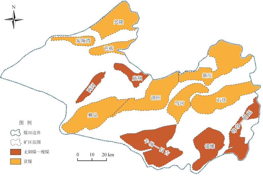 鎮(zhèn)威煤田煤變質(zhì)程度相對較高,煤類以瘦煤、貧煤和無煙煤為主,揮發(fā)分含量介于2% ~ 28%,鏡質(zhì)組最大反射率介于1.95% ~ 2.74%。受構(gòu)造作用影響[13],最大變質(zhì)程度分別達(dá)到貧煤與無煙煤的礦區(qū)表現(xiàn)為近東西向條帶在南北方向相間分布,無煙煤主要分布于母享—則底、鎮(zhèn)雄、牛場—以古以及兩河、廟壩礦區(qū),貧煤主要分布在石坎、新莊、馬河、彝良、洛旺以及興隆、炭場灣、芭蕉礦區(qū)(圖8)。