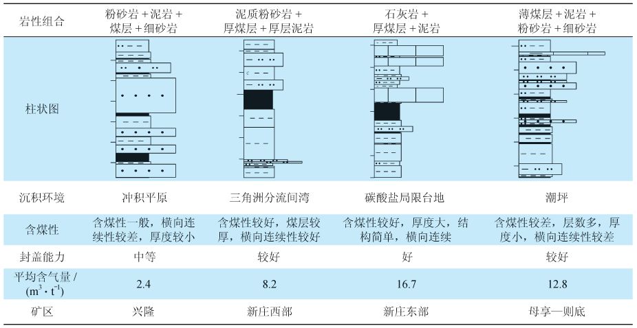 龍?zhí)督M主要為海陸過渡相沉積,包括三角洲平原、潮坪沉積相。長興組主要為海相沉積,以碳酸鹽潮下帶為主,煤層頂?shù)装鍘r性組合包括沖積平原中的粉砂巖+泥巖+煤層+細(xì)砂巖、碳酸鹽局限臺地中的石灰?guī)r+厚煤層+泥巖、三角洲間灣中的泥質(zhì)粉砂巖+厚煤層+厚層泥巖以及潮坪中的薄層煤層+泥巖+粉砂巖+細(xì)砂巖(表2)??傮w上,海陸過渡相沉積封蓋能力較強(qiáng),陸相沉積封蓋能力較弱,符合常見沉積體系與封蓋體系之間的關(guān)系[20-21]。