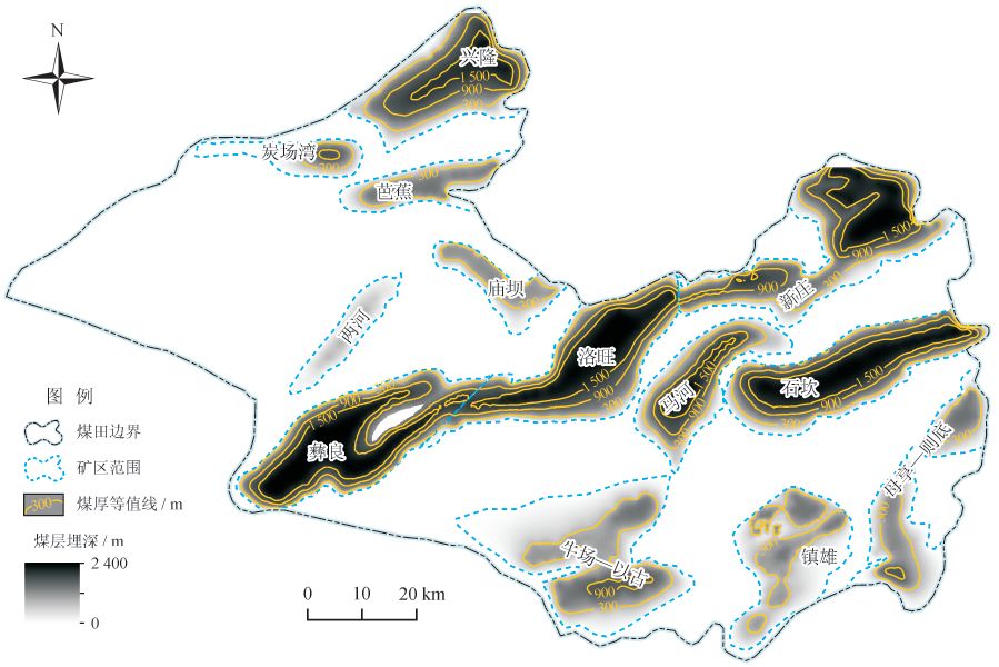 鎮(zhèn)威煤田各礦區(qū)向斜構(gòu)造中煤層埋深由南向北呈深淺相間的分布特征,整體上煤田東南部煤層埋深較淺,包括母享—則底、鎮(zhèn)雄、牛場—以古礦區(qū),一般不超過1 000 m。煤田中部各礦區(qū)向斜軸部煤層埋藏較深,深度超過1 500 m,煤層氣保存條件較好,包括石坎、馬場、新莊、洛旺及彝良礦區(qū)。而煤田西北部僅鹽津礦區(qū)埋藏較深,可達(dá)1 500 m,其余礦區(qū)埋深均未超過1 000 m(圖6)。