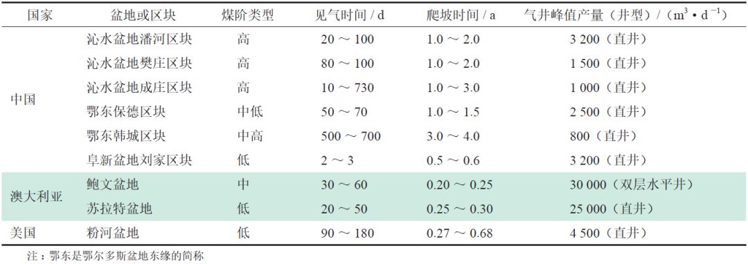 表2 中外煤層氣產(chǎn)區(qū)氣井見氣時(shí)間、產(chǎn)氣爬坡期數(shù)據(jù)對(duì)比表