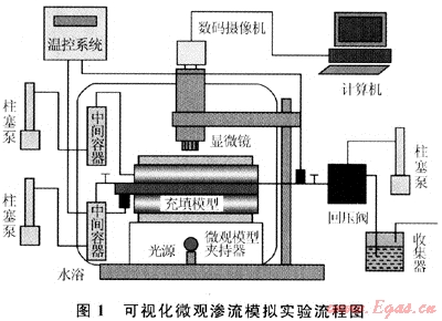 通過(guò)二維可視化物理模擬技術(shù)[4],可以定性和定量地觀察流體在地層內(nèi)的流動(dòng)變化。二維可視化物理模擬技術(shù)分為間接技術(shù)和直接技術(shù)。間接技術(shù)主要有X射線、γ射線等菹接技術(shù)運(yùn)用光源的照射,通過(guò)照相、攝像等使流動(dòng)實(shí)驗(yàn)過(guò)程可視化,直接技術(shù)相對(duì)成熟。