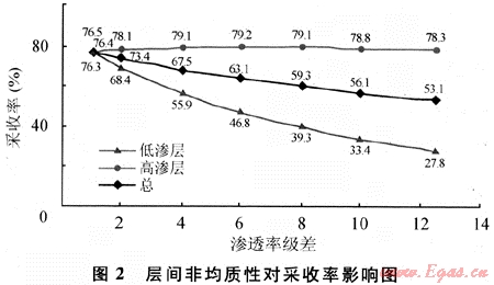 采用數(shù)值模擬描述分層的儲量動用情況與前兩者一致,隨著滲透率級差的增大,高滲層(恒為25×10-3μm2)儲量動用變化不大,而低滲層的儲量動用越來越差,當(dāng)級差為6時,采收率為63%,低滲層只采出47%(圖2)。