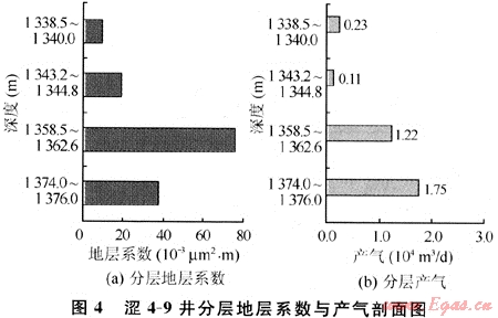 澀北一號氣田四-1單元各井滲透率5.4×10-3~49.1×10-3μm2,滲透率級差為1.8~54.7,各井表現(xiàn)為強中等非均質(zhì)性。產(chǎn)氣剖面測試結(jié)果表明,各井在縱向上產(chǎn)量貢獻(xiàn)差異非產(chǎn)大。如澀4-9井最大滲透率為16.3×10-3μm2,滲透率級差為3.7,地層系數(shù)越高(圖4-a),分層產(chǎn)量也越高(圖4-b),由此可見,多層合采時層間非均質(zhì)性嚴(yán)重影響低滲層的儲量動用。