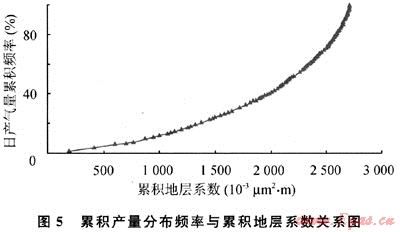 選用該射孔單元共17口井55井次產(chǎn)氣剖面測試數(shù)據(jù),同一口井多次測試分層產(chǎn)量選取其平均產(chǎn)量。按滲透率由大到小進(jìn)行排序,對各小層的產(chǎn)量、地層系數(shù)(Kh)和儲容系數(shù)(φhSg)進(jìn)行累加,作累積產(chǎn)量分布頻率與累積地層系數(shù)關(guān)系圖(圖5)。