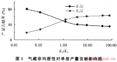 物理模擬實驗研究結(jié)果也證實了這一結(jié)論:兩層合采時,K1層產(chǎn)量貢獻(xiàn)率隨K2/K1比值增加而降低,當(dāng)兩層滲透率相同時各產(chǎn)層產(chǎn)量貢獻(xiàn)率幾乎相同,即兩層都能被充分動用(圖1)。