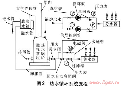 熱水循環(huán)系統(tǒng)流程見圖2。循環(huán)泵設(shè)在鍋爐的出水側(cè),即燃?xì)獬簾崴仩t出水管與循環(huán)泵入口連接。循環(huán)泵的揚(yáng)程為管道水頭損失加上鍋爐與供熱系統(tǒng)最高點(diǎn)之間的重力水頭及附加水頭余量之和。