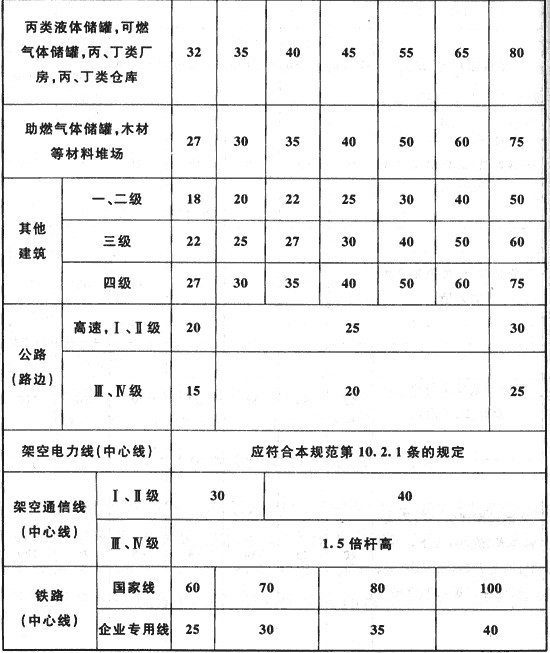 表4.4.1 液化石油氣供應(yīng)基地的全壓式和半冷凍式儲罐(區(qū))與明火或散發(fā)火花地點(diǎn)和基地外建筑等的防火間距(m)