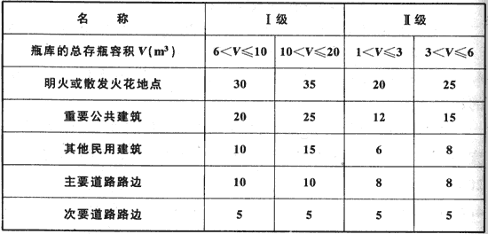 表4.4.5 Ⅰ、Ⅱ級瓶裝液化石油氣供應(yīng)站瓶庫與站外建筑等的防火間距(m)