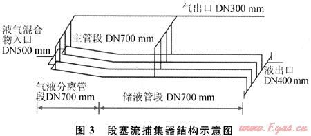 4) 以O(shè)LGA軟件的計算結(jié)果為依據(jù),根據(jù)本工程的實際情況和國際上的經(jīng)驗,采用指狀管式段塞流捕集器,應(yīng)用國際先進(jìn)的計算方法,確定段塞流捕集器的結(jié)構(gòu)與尺寸并自行進(jìn)行機(jī)械設(shè)計[1]。指狀管段塞流捕集器主要由4根口徑為DN700mm、長度為70m的并聯(lián)管道構(gòu)成(圖3),可捕集的混輸干線最大液塞長度為500m。