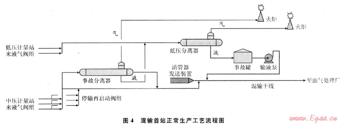 5) 在混輸首站,采用可隨時快速將油井產(chǎn)物的中壓氣液混輸流程轉(zhuǎn)換為中、低壓二級氣液分離流程的事故分離器過流運(yùn)行工藝,其工藝流程詳見圖4、5。