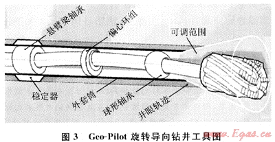 Geo-Pilot[2~3]是一種不旋轉(zhuǎn)套式導(dǎo)向工具(圖3),屬于指向式旋轉(zhuǎn)導(dǎo)向鉆井工具。它不是靠偏心穩(wěn)定器的翼肋推靠井壁偏置鉆頭進(jìn)行導(dǎo)向,而是靠不旋轉(zhuǎn)套與萬(wàn)向短節(jié)之間的一套偏心機(jī)構(gòu)使萬(wàn)向軸偏置,從而為鉆頭提供了一個(gè)與井眼軸線(xiàn)不一致的傾角,產(chǎn)生導(dǎo)向作用。該機(jī)構(gòu)由幾個(gè)可控制的偏心環(huán)組合而成,當(dāng)井下自動(dòng)控制完成偏心環(huán)組合之后,該機(jī)構(gòu)將相對(duì)于不旋轉(zhuǎn)套固定,從而始終將萬(wàn)向軸向固定方向偏置,為鉆頭提供一個(gè)方向固定的傾角。
