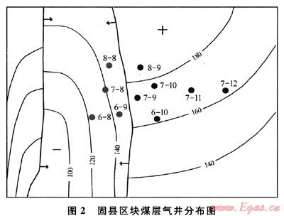 沁水煤層氣田固縣區(qū)塊投產10口煤層氣井(圖2),煤層埋深、厚度、頂底板巖性、煤質等參數基本相同,但排采效果差別大。6口高產井平均產氣量4115m3,產水量極小。4口未產氣井,產水量很大,累計產水1800~2800m3。其原因是10口井位于兩個不同的地質單元,成藏條件不同;斷裂鼻狀構造和斷裂背斜構造軸部氣富水貧,斷槽內氣貧水富:固6-10、7-9、7-10、7-11、7-12、8-9井6口高產氣井位于斷鼻和斷裂背斜軸部,煤層分布穩(wěn)定,頂底板封蓋條件好,含氣量高;而固6-8、6-9、7-8、8-8井4口未產氣井都位于兩條斷層夾持的斷槽向斜內。由于小斷層發(fā)育,煤層連續(xù)性遭到破壞,含氣量降低,被稱為水槽,單井日產水幾十立方米。