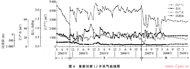 阜新劉家區(qū)塊LJ井2003年投產(圖4),初期日產氣4500m3,穩(wěn)產4a開始遞減,目前日產氣2780m3,已累計采出662×104m3,采出程度26.6%,預計采收率50%。解吸類型劃分為阻礙解吸(高液面)、暢通解吸、低飽和解吸3個階段。①阻礙型解吸:解吸速率大于降壓速率,氣泡變形,解吸困難;②暢通型解吸:解吸速率接近降壓速率,氣泡帶出部分束縛水,產量理想;③低飽和解吸:解吸速率小于降壓速率,應力閉合。從中國目前煤層氣開采現狀分析,直井第一階段一般小于1a;第二階段井距為300m×300m一般可采4~6a,與井距、煤厚和排采速度等有關;第三階段開采時間較長,羽狀水平井穩(wěn)產階段更短,為1~3a。