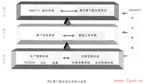重慶燃?xì)饧瘓F(tuán)充分利用現(xiàn)代計(jì)算機(jī)和通訊技術(shù),創(chuàng)建了先進(jìn)的客戶服務(wù)信息系統(tǒng),包括生產(chǎn)管理、營(yíng)銷(xiāo)管理、客戶資料、客戶服務(wù)工單、966777服務(wù)熱線五個(gè)方面,整個(gè)系統(tǒng)資源共享、無(wú)縫銜接,為客戶提供精細(xì)服務(wù)。服務(wù)流程是客戶服務(wù)工作的導(dǎo)向,為保證服務(wù)流程的統(tǒng)一,集團(tuán)公司通過(guò)建設(shè)客戶服務(wù)信息系統(tǒng),對(duì)服務(wù)流程進(jìn)行優(yōu)化,并在信息系統(tǒng)中對(duì)關(guān)鍵流程進(jìn)行固化。見(jiàn)圖2: