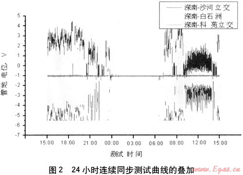 表1為深南-科苑立交、沙河立交、白石洲管地電位24小時連續(xù)同步測試數(shù)據(jù),圖2為上述測試點的24小時連續(xù)同步測試曲線的疊加。