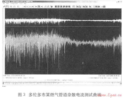 美國腐蝕工程師學(xué)會(NACE)在2004年發(fā)布了一篇報告《對影響管道的雜散電流的一種測試技術(shù)》,報告中提出可以采用SCM測試儀等方法對影響管道的雜散電流進(jìn)行測試,并以加拿大多倫多市的一條燃?xì)夤芫€的測試數(shù)據(jù)為例進(jìn)行分析,詳見圖3。測試數(shù)據(jù)顯示,燃?xì)夤艿朗艿诫s散電流干擾,報告中分析干擾信號與附近電氣化鐵路的運行有關(guān),應(yīng)該是來源于鐵路的運行。