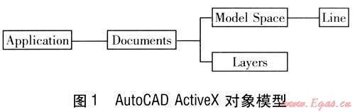 Documents對(duì)象下面有Model Space(模型空間)及Layers(圖層)等一系列對(duì)象集合。Model Space是圖形文件中的圖形實(shí)體集合,如Line(直線),每個(gè)實(shí)體均可通過相應(yīng)對(duì)象的屬性進(jìn)行操作,改變或得到相應(yīng)的參數(shù),如直線坐標(biāo)。Layers是圖層集合,通過對(duì)Layers對(duì)象的引用可以得到圖層集合的子對(duì)象,如Layer。