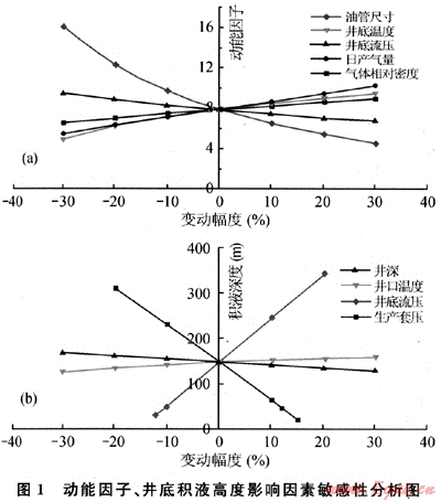 敏感性分析是分析各種不確定性因素變化到一定的幅度時(shí),對(duì)所關(guān)注指標(biāo)的影響程度,并把不確定性因素當(dāng)中對(duì)關(guān)注指標(biāo)影響程度較大的因素,稱(chēng)之為敏感性因素[4~5]。由圖1可以看出動(dòng)能因子對(duì)生產(chǎn)油管的內(nèi)徑尺寸敏感性最強(qiáng),其次是日產(chǎn)氣量和井底流動(dòng)壓力,而氣體的相對(duì)密度和井底溫度的變化對(duì)動(dòng)能因子影響較小。由此我們可以得出結(jié)論:當(dāng)以目前的產(chǎn)量下不能完全攜液時(shí),及時(shí)地更換較小管徑的管柱生產(chǎn)能有效地提高氣井的攜液能力。當(dāng)氣井的流量下降到臨界流量以下后,氣井不能依靠自己的能量完全排出地層產(chǎn)出的液體,就會(huì)在井底出現(xiàn)不同程度的積液。由圖1可以看出積液高度對(duì)管鞋處的壓力、井口套壓極其敏感,所以要準(zhǔn)確判斷井底積液的高度,一定要取準(zhǔn)井口的生產(chǎn)套壓和井底管鞋處的流動(dòng)壓力,否則計(jì)算出的結(jié)果誤差較大。