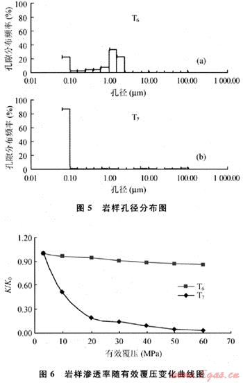 T6(K0’=12.62×10-3μm2,φ0=14.8%)和T7(K0’μm2,φ0=3.7%)是孔滲參數(shù)差=0.079×10-3異較大的兩塊巖樣。從巖樣的孔徑分布圖與覆壓滲透率變化曲線(圖5、6)可以看出:對于低孔低滲透巖樣,小孔徑占了絕大多數(shù),在覆壓實驗中,小孔道一旦受到壓縮發(fā)生塑性變形就會嚴重喪失滲流功能,導致巖樣的滲透率大幅下降,表現(xiàn)出較強的應力敏感性。