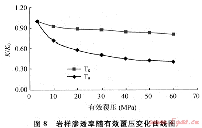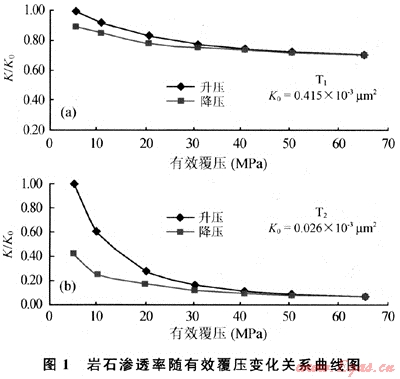 圖1是采用CMS300測得的低滲透巖石滲透率與有效覆壓關系曲線。從圖1可看出:①巖樣初始滲透率(K0’越低,滲透率在有效覆壓增加的過程中的下降幅度越大;②滲透率在有效覆壓增大的初始階段下降幅度最大,覆壓降低后滲透率不能完全恢復,說明巖樣在實驗過程中發(fā)生了微量的軟塑性變形。)