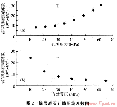 圖2是采用增加圍壓與降低孔隙壓力兩種方法所測得的巖石孔隙壓縮系數(shù)與應力的關系曲線。從圖2中可以看出是變化值而非固定值,初始值很高,隨著圍壓增大、孔隙壓力減小,下降很快,圍壓、孔隙壓力達到一定值后,變化不大,保持穩(wěn)定,這表明在實驗過程中巖石發(fā)生的并非理想的線彈性變形。