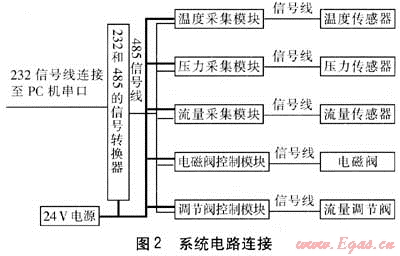 電路設計要根據(jù)測試系統(tǒng)中所選用的儀器儀表來進行。溫度測量采用德國原產(chǎn)溫度傳感器與變送器,Pt100精度等級1/3B,4線制;溫度測量范圍為0~150℃,具有響應時間短、測量精度高等特點,輸出信號4~20mA。流量測量采用德國原產(chǎn)ProcessMaster系列電磁流量計、五點標定后精度為0.2%。電磁流量計根據(jù)法拉第電磁感應定律設計,流量正比于介質(zhì)流速和磁通密度,以及電極間的距離。電壓信號用變送器轉換成標準信號,方便數(shù)據(jù)采集,而且電磁流量計無節(jié)流部件,壓力損失小,減少能耗,只與被測流體的平均速度有關,測量范圍寬。只需經(jīng)水標定后即可測量其他介質(zhì),無須修正,相比于浮子流量計精度大大提高。壓力測量采用德國原產(chǎn)壓力傳感器,測壓范圍為0~3MPa,精度為0.15%,輸出標準電流信號。燃氣消耗量測量采用日本品川濕式氣體流量計,既可以通過流量計的機械表盤讀取燃氣消耗量,也可以通過其發(fā)出的電信號經(jīng)過處理后得到燃氣消耗量。燃氣壓力測量用壓力表量程為0~5kPa,輸出相應的電信號進行數(shù)據(jù)采集。流量調(diào)節(jié)閥選用電動調(diào)節(jié)閥,進行遠程控制。煙氣分析儀采用多組分煙氣分析儀,各組分都有對應的電信號輸出。數(shù)據(jù)采集模塊選用ADAM系列模塊對各參數(shù)進行高精度采集與控制。系統(tǒng)電路連接見圖2。