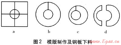 ③ 將剪好的工程紙?zhí)兹肴細(xì)夤艿?,覆蓋到套管上,用錘子垂直擊打工程紙,得到管道與套管之間圖形的壓環(huán)模版,見圖2c。
